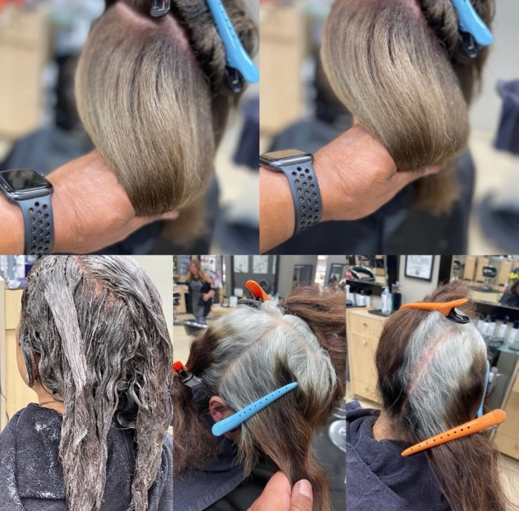Martin carefully painting highlights on his client’s hair, using freehand strokes.