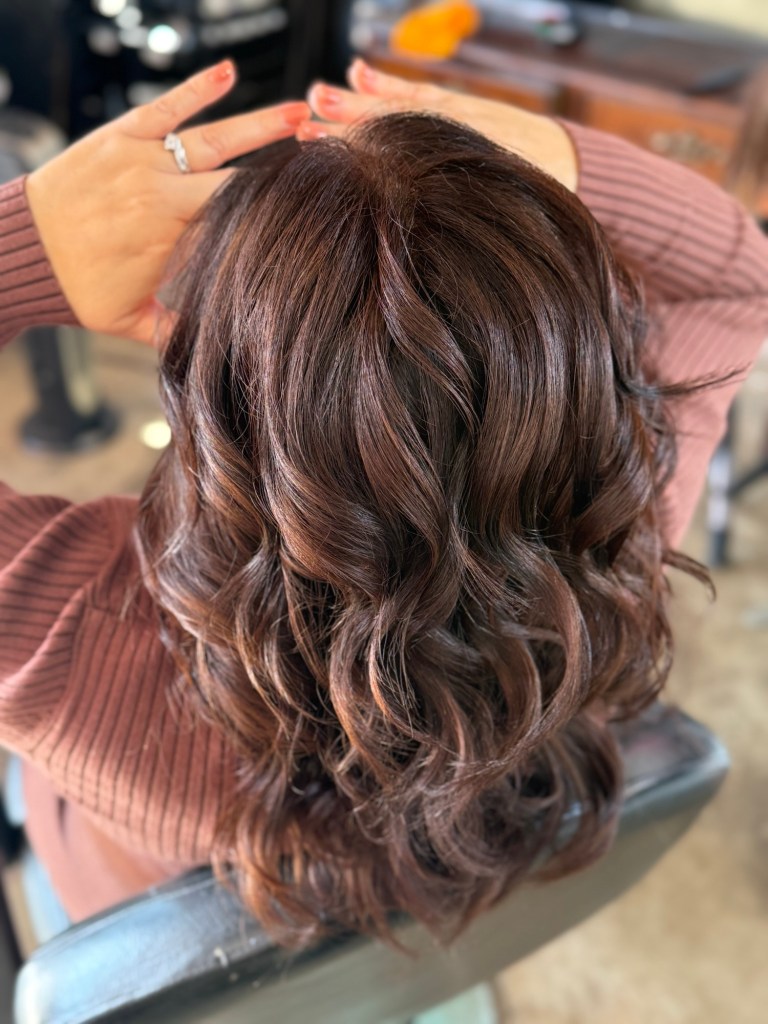 A balanced color scheme with balanced balayage technique on curly Latin hair .brings out the best for texture hair with the right combination of colors from base to ends enhanced colors for your skin tone.